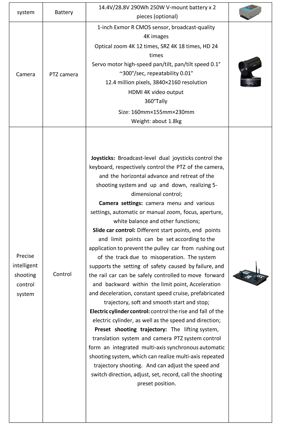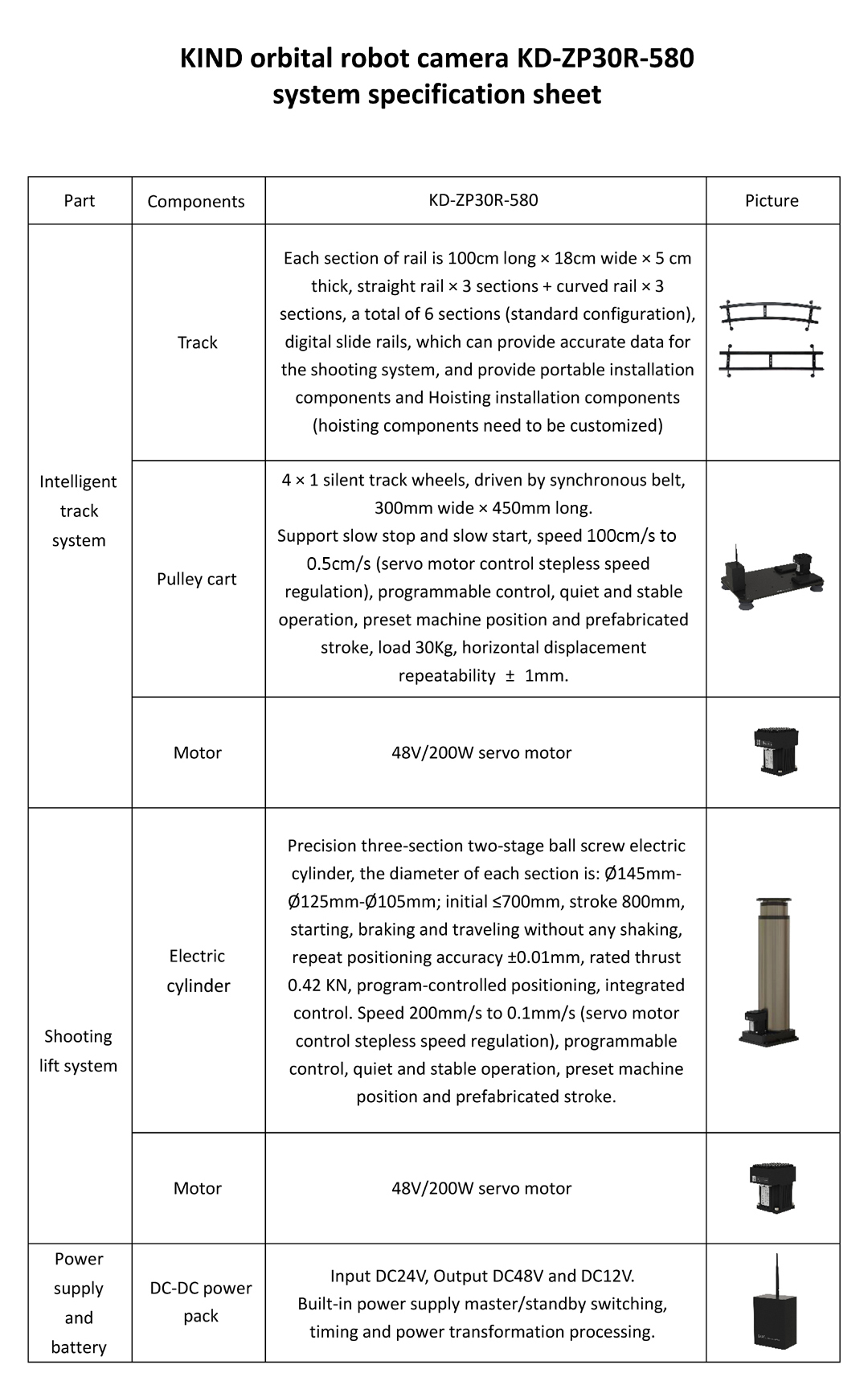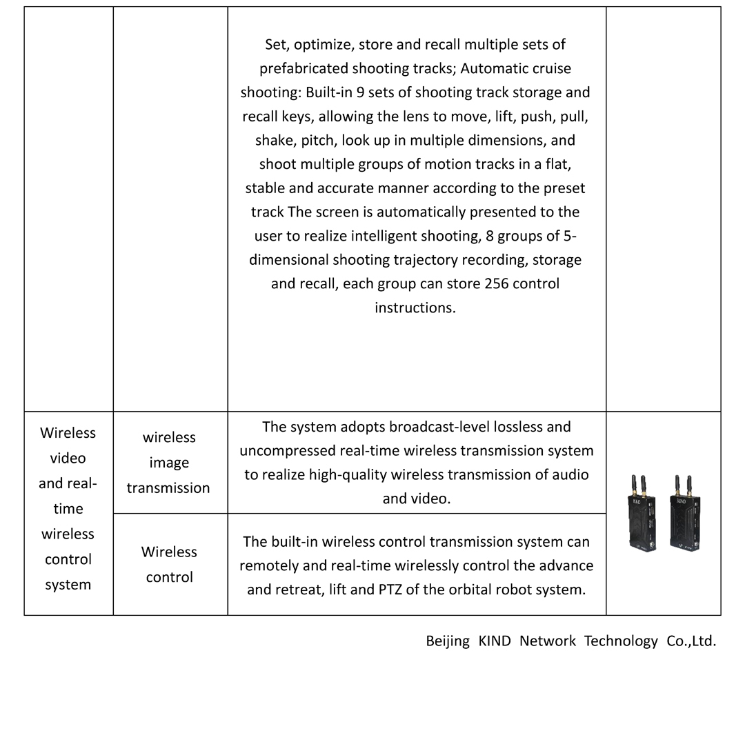 KIND track robot camera system consists of six parts: intelligent shooting track system, shooting lifting system, power supply and battery system, camera system, precise intelligent shooting control system, wireless audio and video transmission and real-time wireless control system.